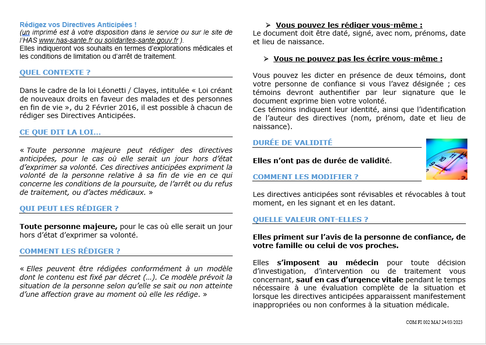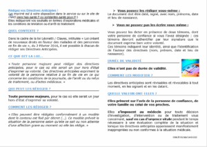 Toute personne majeure peut, si elle le souhaite, faire une déclaration écrite appelée directives anticipées pour préciser ses souhaits concernant sa fin de vie. Ce document aidera les médecins, le moment venu, à prendre leurs décisions sur les soins à donner, si la personne ne peut plus exprimer ses volontés. (Source : https://www.service-public.fr/particuliers/vosdroits/F32010) Si vous le souhaitez, pour le cas où vous seriez hors d’état d’exprimer votre volonté, vous pouvez rédiger des directives anticipées pour faire connaître à l’équipe du CHMB qui vous accompagne vos souhaits relatifs à votre fin de vie et en particulier ceux concernant la possibilité de limiter, d’arrêter ou de refuser des traitements. Ce document doit être écrit et signé par vous et comporter vos noms, prénoms, date et lieu de naissance. Les directives anticipées sont révisables et révocables à tout moment et par tous moyens.